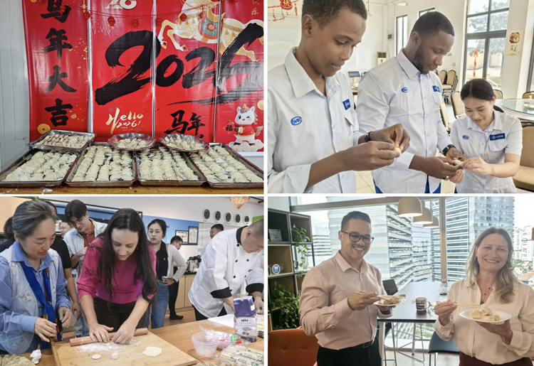 لا يمكن لأحد مقاومة متعة إعداد الجياوزي. وبإرشاد دقيق من الموظفين الصينيين، تعلّم الزملاء الأجانب كيفية إعدادها، حيث تحولت حركاتهم من التردد إلى المهارة تدريجيا. وعندما خرجت الجياوزي الساخنة من القدر، اجتمع الجميع لتقاسم هذا الطعم الفريد لعيد الربيع. كما تذوّق الموظفون الصينيون بدورهم أطباقا محلية مميزة من البلدان المضيفة